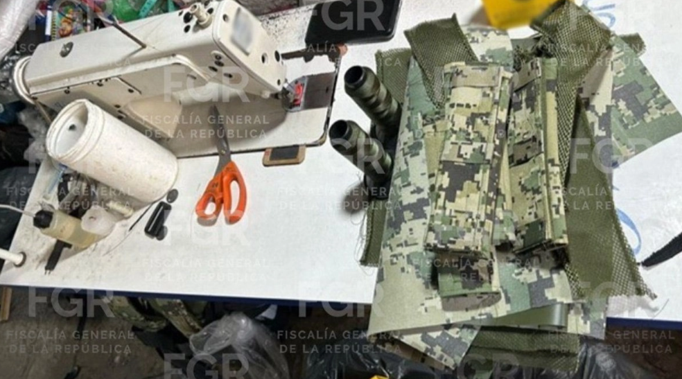 Durante la intervención, se aseguraron seis máquinas de coser industriales, una cortadora de tela, seis chalecos verdes tipo camuflaje, seis chalecos negros —algunos con insignias de la PolicÃa Estatal—, un chaleco camuflado en tonos verde y café, un rollo de tela camuflada en colores café, verde y rojo, asà como un fragmento de tela bordada con el nombre de una institución de las Fuerzas Armadas de México.