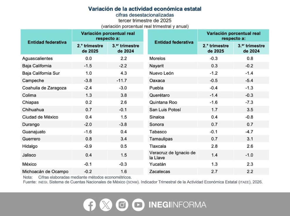 Durante el tercer trimestre de 2025, cuando el Producto Interno Bruto (PIB) nacional registró una contracción de 0.3 %, 15 entidades federativas mostraron retrocesos trimestrales, 16 presentaron avances y una permaneció sin cambios, según informó el Instituto Nacional de EstadÃstica y GeografÃa (Inegi).