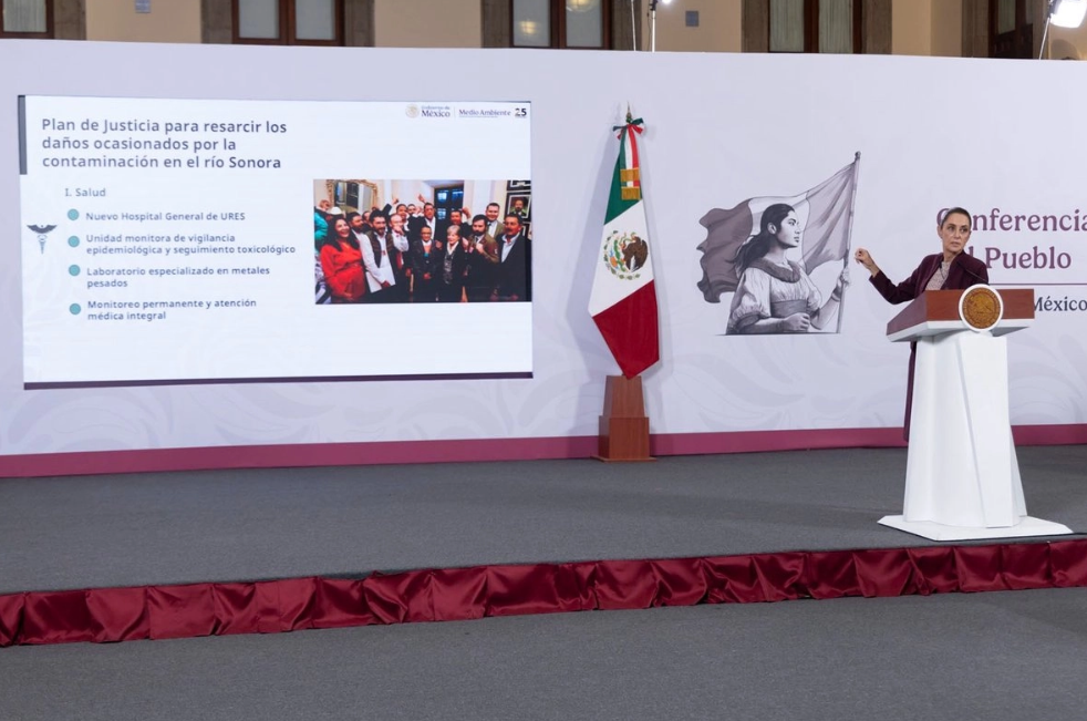 Durante su conferencia matutina en Palacio Nacional, Sheinbaum destacó la magnitud del desastre: el derrame de aproximadamente 40 mil metros cúbicos de sulfato de cobre, generado por la filial Buenavista del Cobre, afectó 288,8 kilómetros de la cuenca del río y a 20 mil personas de municipios como Arizpe, Aconchi, Banámichi, Baviácora y Ures.